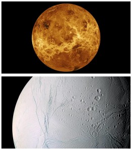 Venus, top, by NASA/JPL-CalTech: Saturn’s ice moon Enceladus, bottom, by NASA.