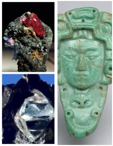 Ruby, by Stranger Than Kindness via Wikimedia, CC BY-SA 3.O; Uncut diamond, by USGS via Wikimedia,public domain; Mayan jadeite amulet, by Metropolitan Museum of Art via Wikimedia, public domain.
